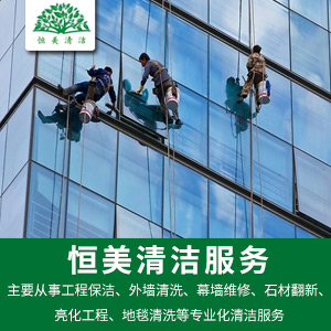 公司擁有各類專業化管理人員,主要從事工程保潔、外墻清洗、幕墻維修、石材翻新、亮化工程、地毯清洗等專業化清潔服務。